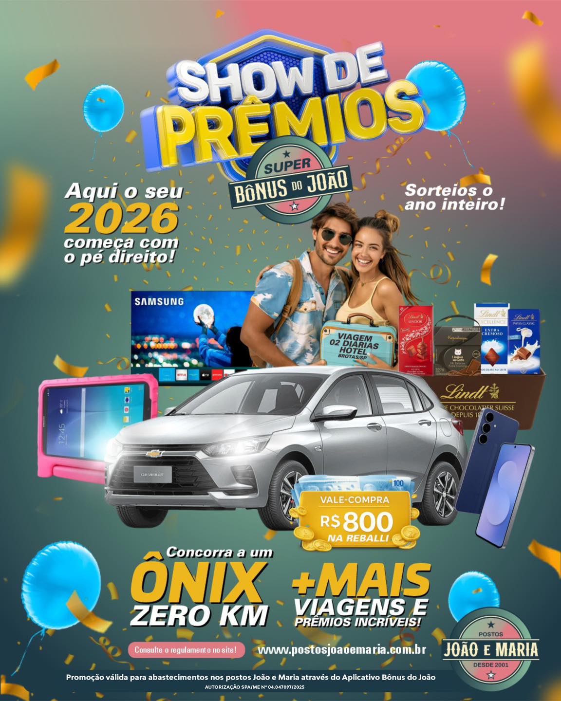 Abasteça e concorra a um CARRO 0KM E MUITOS PRÊMIOS.Abasteça nos Postos João e Maria pelo Aplicativo Bônus do João e gere cupons automaticamente a cada abastecimento. São sorteios o ano todo. Quanto mais você abastece pelo app, mais chances de ganhar. Promoção válida...